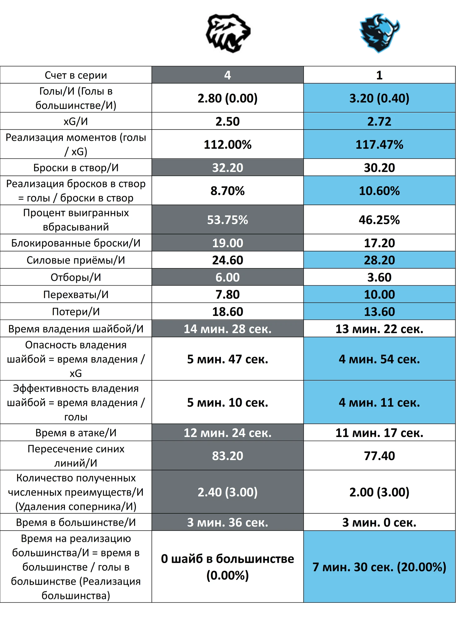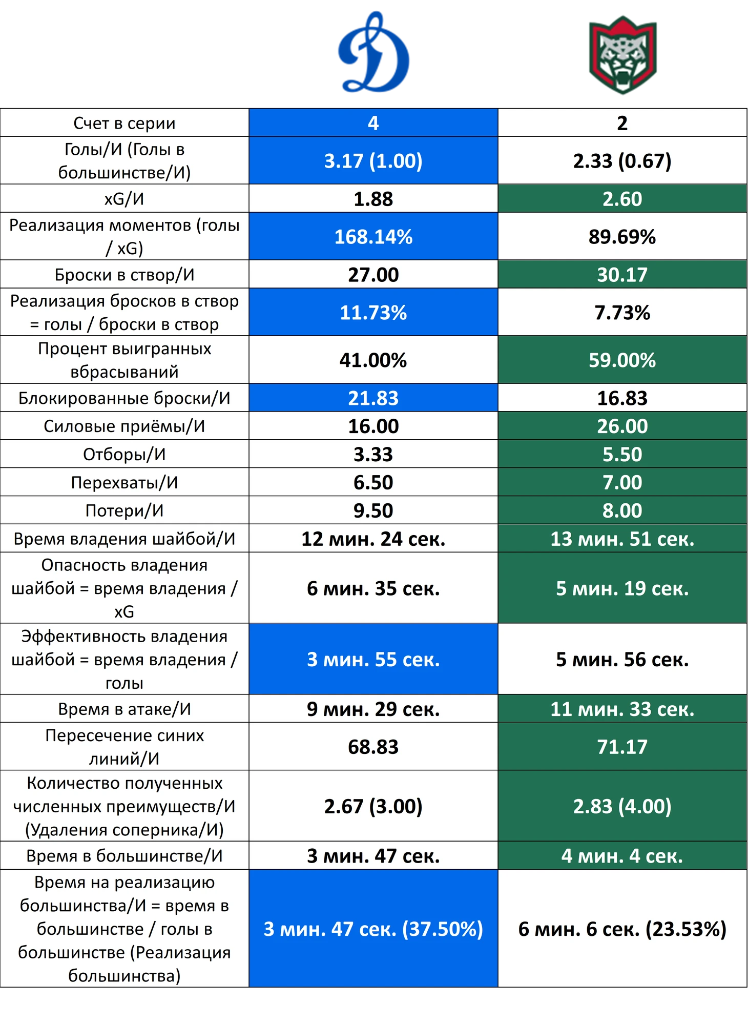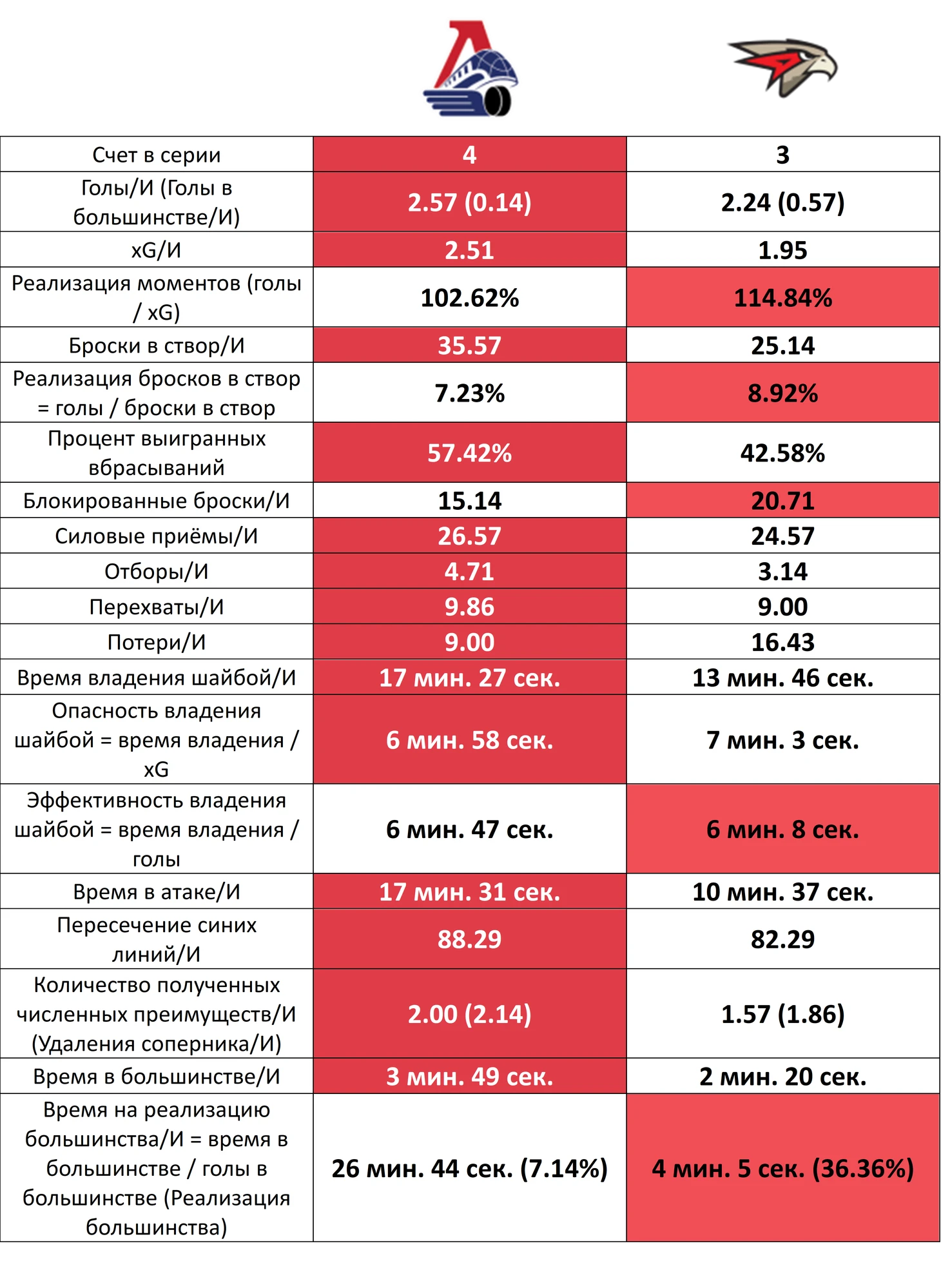 По статистике бросается в глаза огромная доминация Локомотива по нескольким показателям. Большой перевес по времени владения, а время в атаке почти в 2 раза больше, чем у оппонента. Из этого логически следует преимущество по броскам и созданным моментам. Удивительно, что с таким перевесом по владению, ярославцы оказались лидерами ещё и по силовым приёмам. Удивительно это в сравнении с их первыми сериями, т.к. по итогам регулярного чемпионата Локомотив и Авангард имели примерно равную статистику силовых приёмов, но в первом раунде у Локомотива их было заметно меньше даже при меньшем владении. Как было ранее отмечено в статье про первый раунд, нередко количество силовых приёмов больше у команды, которая меньше владеет шайбой, тем самым стараясь её вернуть за счёт дополнительной агрессии. У Авангарда же бросается в глаза большое количество потерь шайбы. Также продолжилась доминация Локомотива при игре на точке. Но для данной пары это вполне закономерно, Авангарду было сложно при вбрасываниях и против Металлурга, тогда ключевую роль сыграл их лучший центровой Майкл Маклауд (65,4% в регулярном чемпионате и плей-офф), но он был вынужден покинуть расположение команды по ходу второй серии. Кажется удивительным, что серия ушла в седьмой матч, а в одной игре ярославцы не смогли пробить ворота омичей. Чем таким смог ответить Авангард? В первую очередь – игрой в неравных составах. Омичи сыграли очень надёжно в меньшинстве (Локомотив – 3-я команда по проценту большинства в регулярном чемпионате, Авангард – 7-я по проценту меньшинству) – пропущена всего 1 шайба, а сами при этом забили 4 в большинстве (Авангард – 2-я команда по проценту большинства в регулярном чемпионате, Локомотив – 5-я по проценту меньшинству). Возможно, сыграл фактор Антона Курьянова (тренер ярославцев по большинству), который по ходу сезона перешёл из стана омичей к ярославцам. Также хочется отметить, что Авангард, имея заметно меньшее время владения, смог создать достаточно моментов, что вкупе с нормальной реализацией (выше, чему соперника) и надёжной игрой у своих ворот позволило забрать 3 игры и уйти в овертайм в 7-й.
