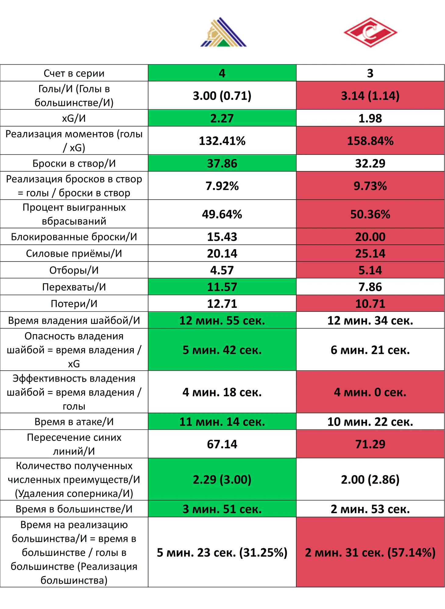 Судя по статистическим итогам, вполне закономерно, что серия закончилась в семи матчах. Одна из команд была несколько лучше в одних показателях, вторая – в других. Что хочется отметить, так эту игру в неравных составах. В первом раунде Сибирь показала, что Салават не очень надёжно действует в меньшинстве, но в целом этого можно было ожидать, потому что Сибирь заходила в плей-офф, как лучшая команда по реализации большинства, в итоге им на одну шайбу требовалось примерно 3,5 минуты. Но во втором раунде Спартак показал ещё лучшую реализацию, им требовалось всего 2,5 минуты на шайбу, хотя по проценту реализации большинства в регулярном чемпионате Спартак занимал всего лишь 13 место (такое же место среди команд, вышедших в плей-офф). Интересно и то, что из первого раунда в следующий круг вышли команды с лучшей реализацией моментов и бросков, но во втором круге эта тенденция была нарушена, что будет видно в дальнейшем.