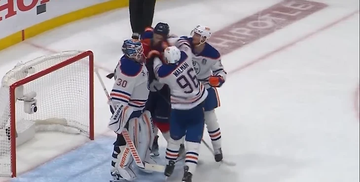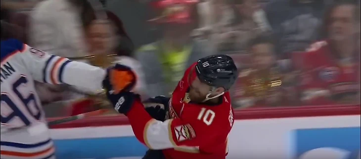 Началось все с небольшой стычки Энтони-Джоном Гриром из «Флориды» и Джейком Уолмэном. Закончилось все вероломной кражей – защитник «Ойлерс» лишился краги и поехал на скамейку без части амуниции.
