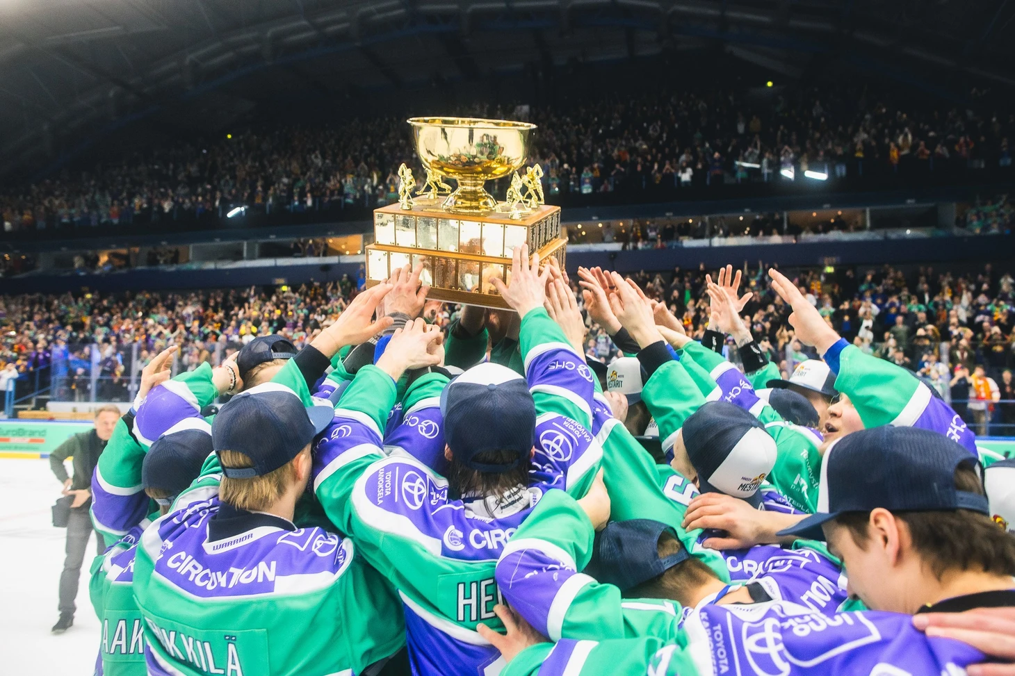 Команда Лулео из одноименного города обыграла в финале Брюнес ИФ из Евле. А ведь только в прошлом сезоне Брюнес выиграл HockeyAllsvenskan и заслужил право играть в элитном дивизионе, отличная динамика. 6 матчей с 19 апреля по 1 мая, 4:2 в серии. В очередной раз отмечу традиции с золотыми шлемами и необычный для хоккея кубок.