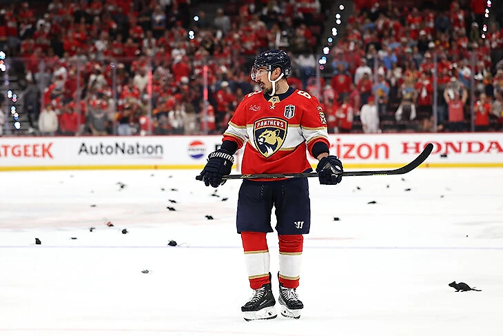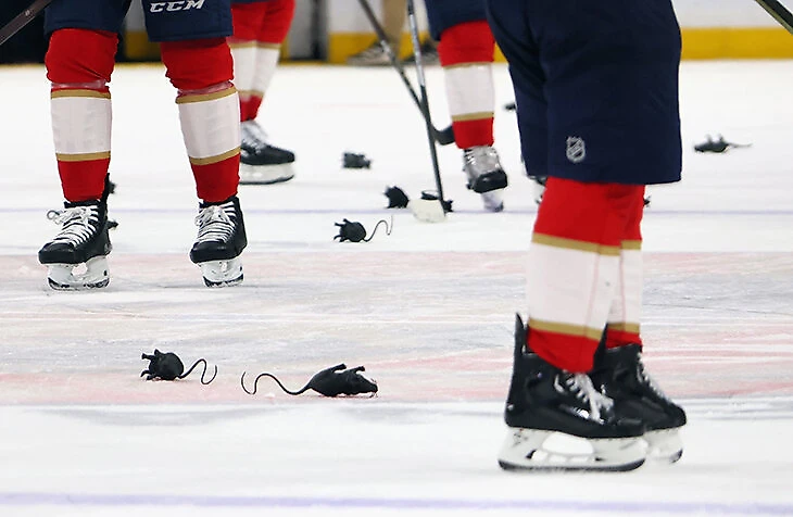 Густая борода – главная, но не единственная плей-офф-скрепа в НХЛ-2025. В лаборатории «Флориды» на одном подоконнике с чемпионскими схемами созрела новая традиция – после каждого победного матча несколько игроков «Пантерс» закидывают крысами (игрушечными!) Брэда Маршанда: