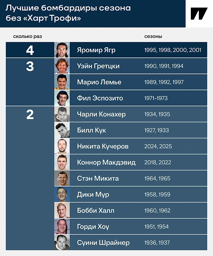 Больше всех недополучил Яромир Ягр. «Харт» у него уводили Эрик Линдрос, Доминик Гашек, Крис Пронгер и Джо Сакик. С Линдросом, правда, было равенство по очкам в 1995-м, но «Арт Росс» получил именно Яромир, потому что больше забил.