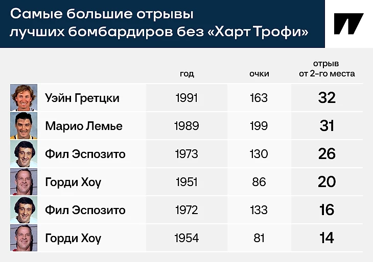 Гретцки два раза получал «Харт» без «Арт Росса» – в 1980-м обошел Марселя Дионна, который стал лучшим бомбардиром по дополнительным показателям, а в 1989-м – Марио Лемье. Зато потом трижды за четыре года пролетал мимо «Харта» сам.