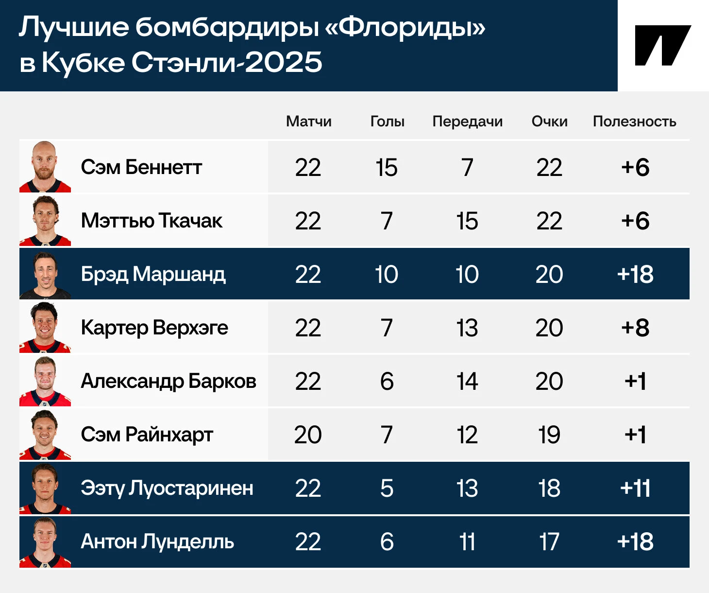 Сам Маршанд проводит чуть ли не лучший плей-офф в карьере. Он набрал 20 (10+10) очков за 22 матча в плей-офф – это третий результат во «Флориде». Еще Брэд делит первое место с Лунделлем по показателю полезности («+18»). В результативности финны лишь немного отстают от Маршанда: Луостаринен выбил 5+13, а Лунделль – 6+11.