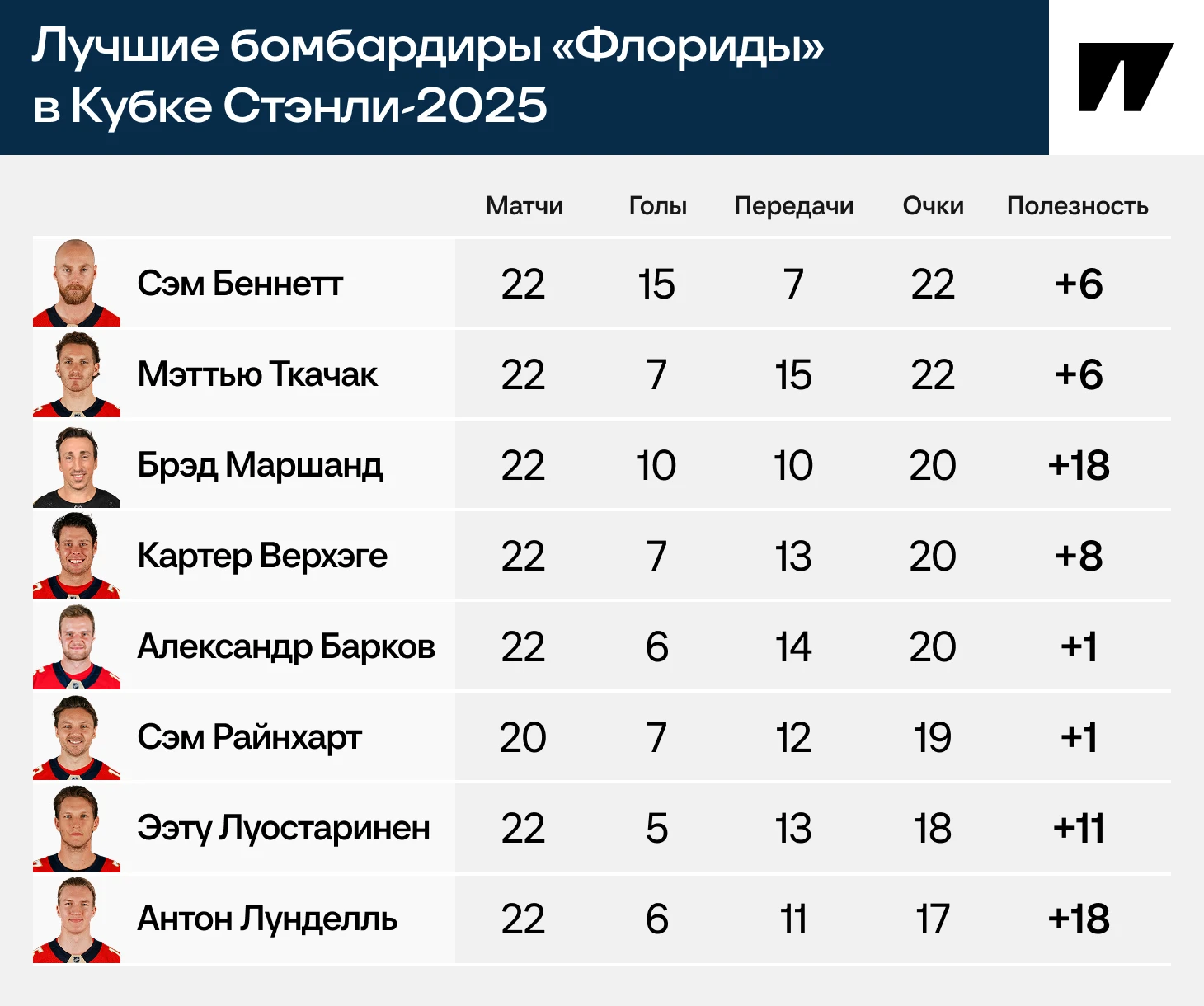 Но и в атаке все звенья «Флориды» опасны. Достаточно лишь взглянуть на таблицу бомбардиров «Пантерс» в этом плей-офф до последнего матча сезона – между первым и восьмым местом всего пять очков. А на третьей строчке расположился Маршанд, который выходит в третьем звене и второй бригаде большинства!