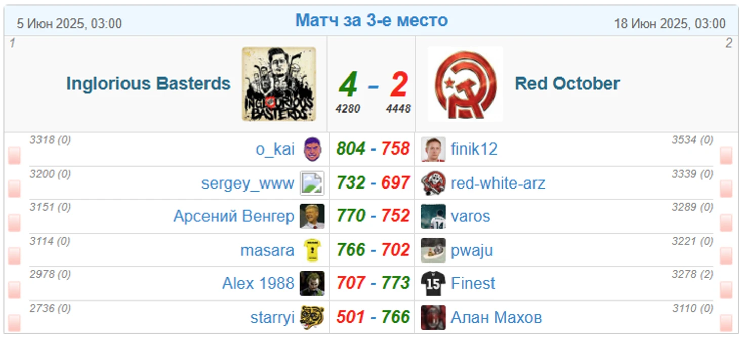 В матче за 3-место команда Inglorious Basterds победила Red October 4-2. Это уже 5-е призовое место команды в турнирах Кубка Стэнли и 13-е(!) призовое место во всех турнирах!