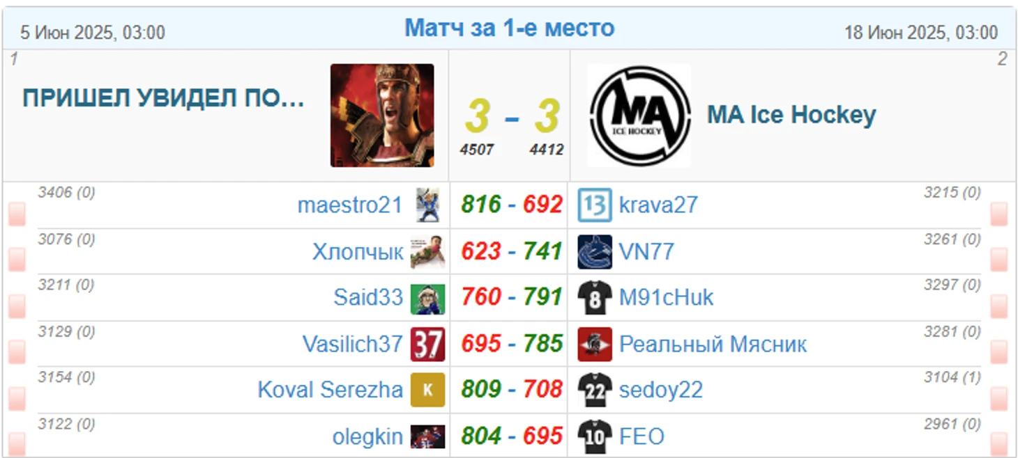 В лиге АХЛ первенствовала команда ПРИШЕЛ УВИДЕЛ ПОБЕДИЛ, победившая MA Ice Hockey по фо 4507-4412. Это победа позволила команде ПРИШЕЛ УВИДЕЛ ПОБЕДИЛ впервые подняться в лигу НХЛ. Поздравляем!
