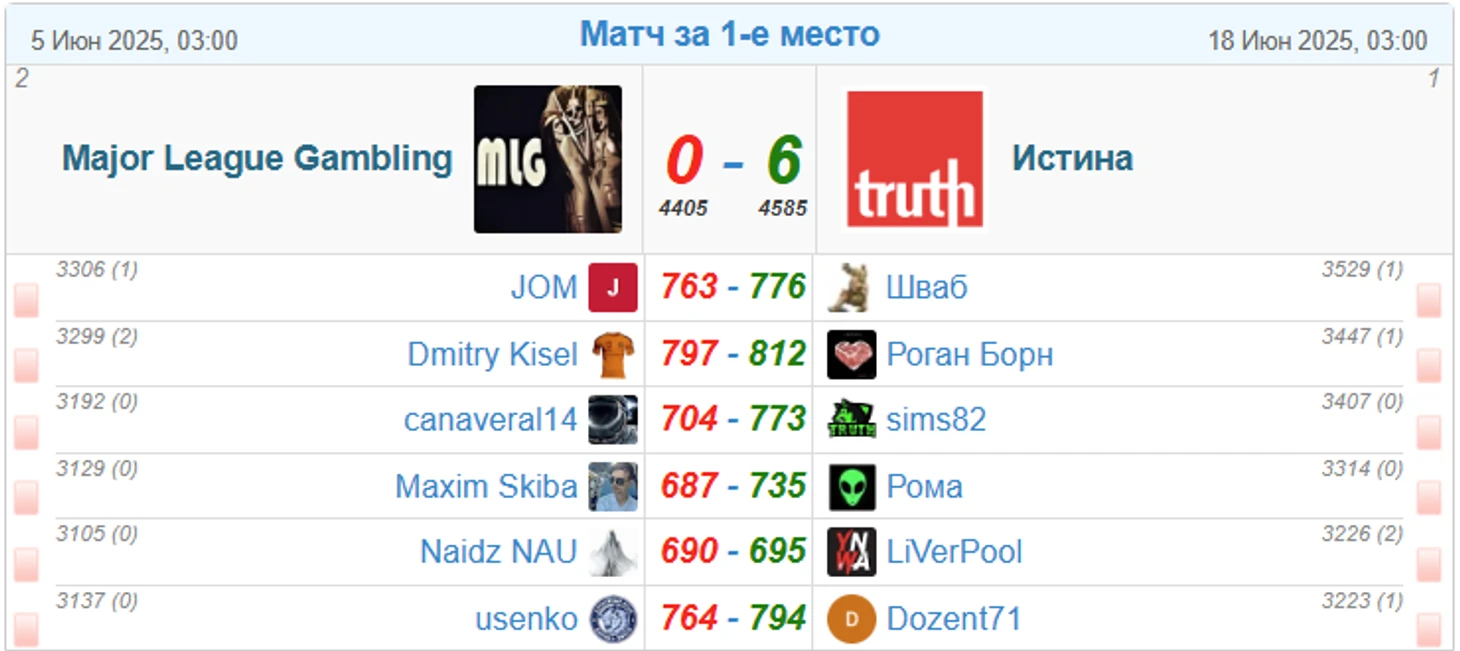 Все свои матчи выиграли сразу трое игроков команды: Шваб, Роган Борн и sims82. Они же все трои закончили в топ-50: 17, 32 и 47 места.