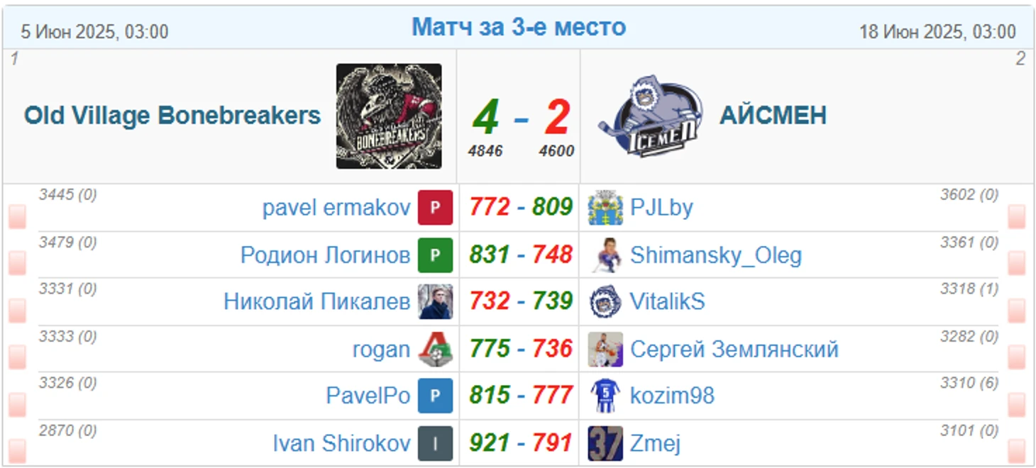 На третьем месте команда Old Village Bonebreakers. победившая команду АЙСМЕН 4-2.