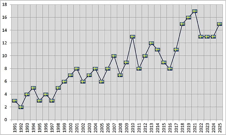 Самое время взглянуть на еще один график – число игроков сборной, имевших опыт игры в Elitserien/SHL. Именно опыт, то есть на графике отмечены и те, кто после Швеции уехал в НХЛ – или, напротив, вернулся домой. Здесь важно то, что все они проходили шведскую школу (и – да, это без учета игроков, не поднявшихся выше Hockeyallsvenskan, второй по силе шведской лиги).