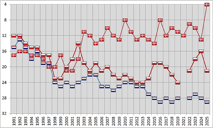 Впрочем, детальное описание датского хоккейного ничтожества не входит в мои планы. Поскольку главная цель – показать высоту прыжка сборной Дании – ограничимся еще парой слов и одной картинкой. Итак: в 90-х сборная Дании выступала на ЧМ заметно хуже сборной Польши и чуть хуже сборной Нидерландов. И вот картинка – результаты выступлений этих команд на ЧМ (место в итоговой классификации) в 1991-2025 гг.:
