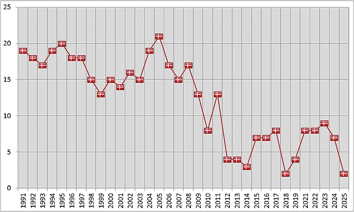 И это, на самом деле, удивительная – уникальная – история. Вплоть до начала двухтысячных Дания была эталонной «экзотической командой». В первый раз сыграли на ЧМ в 1949 г.: рекордные 0:47 в матче с Канадой, 1:25 с Австрией, 3:8 с Бельгией и... досрочный отъезд делегации с турнира. Регулярно играли на чемпионатах мира с 1962 г. – и до конца 80-х уверенно держались в группе С, где могли пропустить вперед Китай или проиграть Болгарии (редко, но – да).
