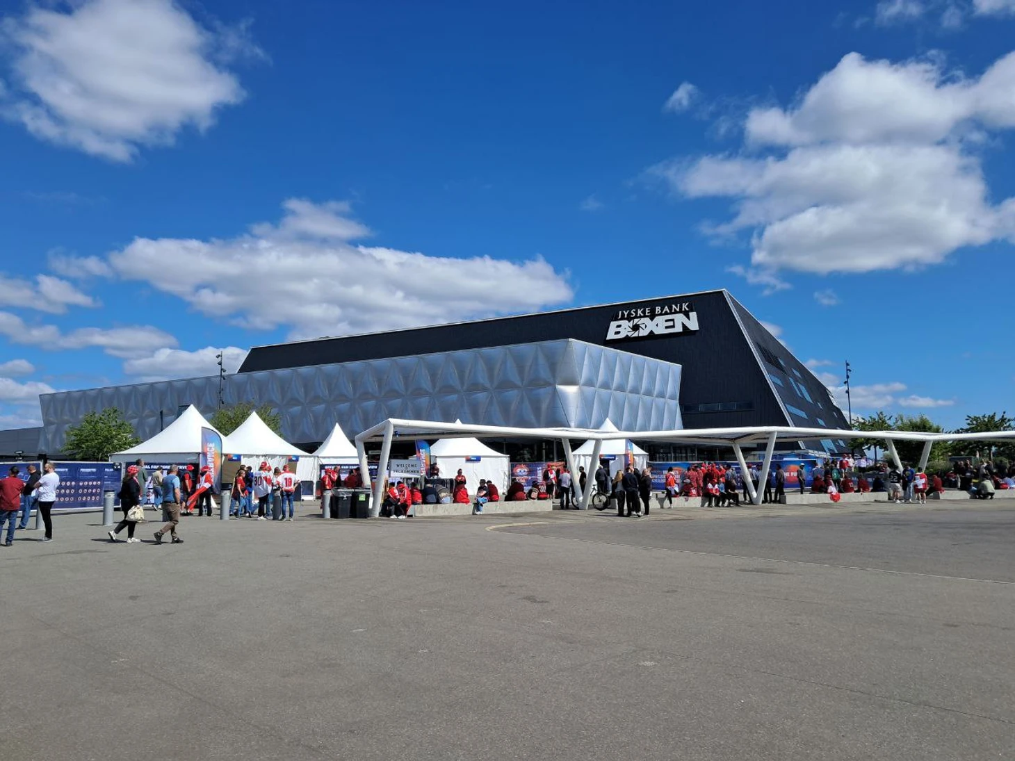 Хернинг принимал чемпионат мира всего второй раз: впервые мировое первенство в этом городке проводили в 2018 году. Многофункциональный комплекс «Jyske Bank Boxen» вмещает 12 000 зрителей, причем арена была открыта в 2010 году. Рядом с хоккейным дворцом находится футбольный стадион, где свои домашние матчи проводит датский клуб «Митьюланд». На территории футбольной арены своя фан-зона, где продают еду и пиво, огромный магазин атрибутики.