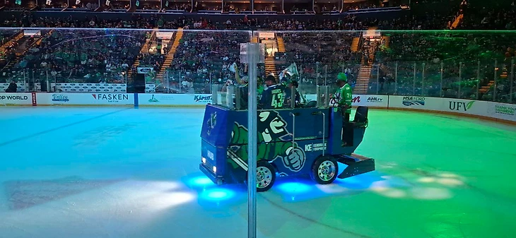 Музыка в перерыве и фоном у «Абботсфорда» повеселее, чем у «старшего брата». Развлечения для публики почти такие же. Разве что в Абботсфорде у VIP-фанатов есть опция покататься на «замбони». В остальном все, как на «Роджерс Арене»: найди стаканчик кофе, найди бублик под стаканчиком, и давайте покажем влюбленных, детей и людей, похожих на селебрити, на большом экране. Сына признали похожим на Бибера. И немудрено: в сплошном окружении бородатых брюнетов нетрудно найти единственного блондина.