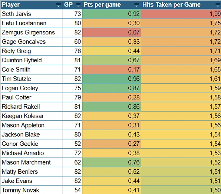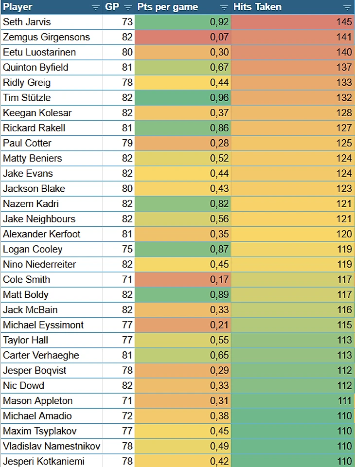 Если наличие в топ-30 парней вроде Колесара, Коттера, Гиргенсонса, МакБэйна и им подобных не удивляет, то видеть Сета Джарвиса главным «выхватывающим», честно признаться, неожиданно. Вот его бьют больше всех — не то что ваш этот Капризов ;-) Как мы видим из таблицы ниже, Джарвис получает на себе почти два хита за матч.