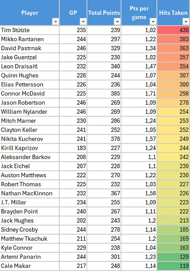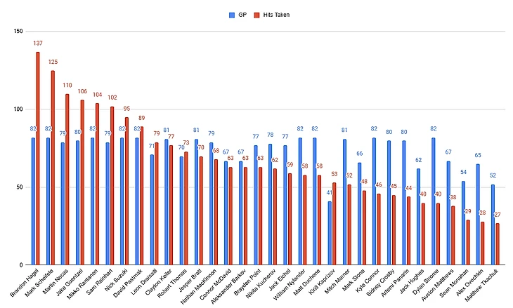 Тут сразу видно, что травматичный Монахан просто такой сам по себе, а не потому что его много бьют. 0,54 хита за игру на нём — это четвёртое место с конца. Да и Мэттьюс вместе с ним внизу таблицы, но в лазарете стабильно каждый сезон.