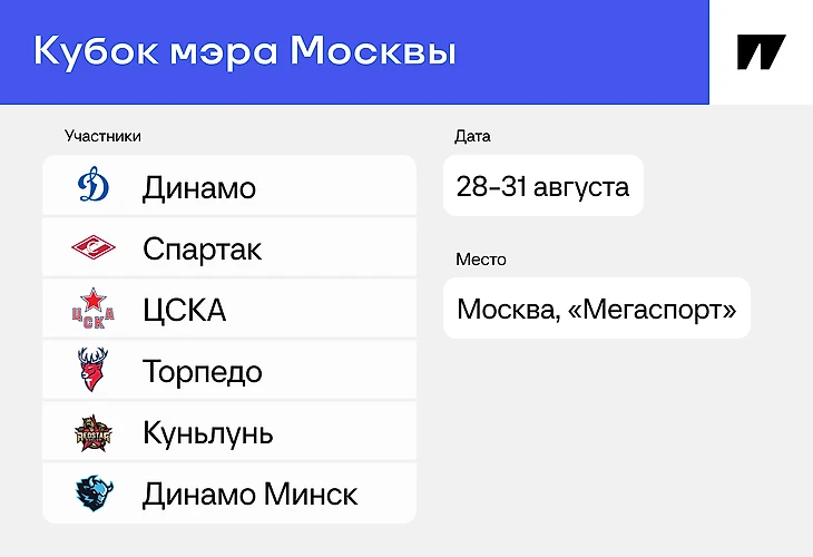 Кубок мэра Москвы получился еще одним из самых длительных. Он пройдет с 28 по 31 августа на «Мегаспорте». Команды разделены на две группы. Откроет турнир столичное дерби «Спартак» – ЦСКА. По итогам первого этапа в последний день пройдут матчи за первое, третье и пятое места.