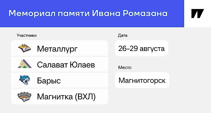 Старейший турнир в расписании предсезонки – магнитогорский Мемориал памяти Ромазана. Это единственное соревнование летом 2025-го, на которое приедет представитель из ВХЛ – «Магнитка». Также участие примут «Металлург», «Салават» и «Барыс». Игры пройдут с 26 по 29 августа по той же круговой системе.