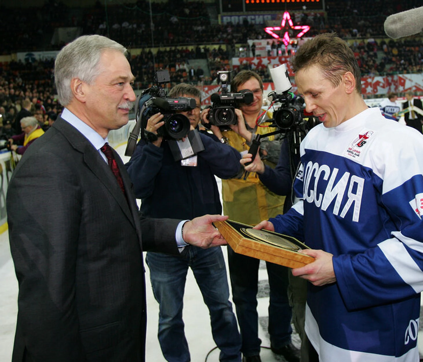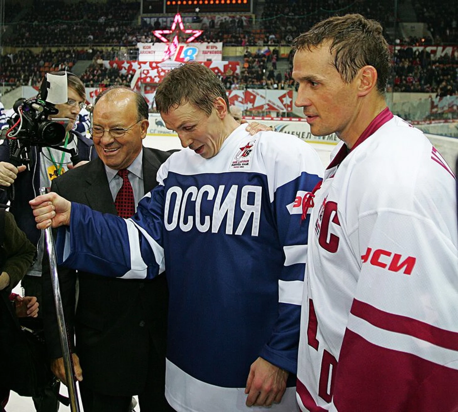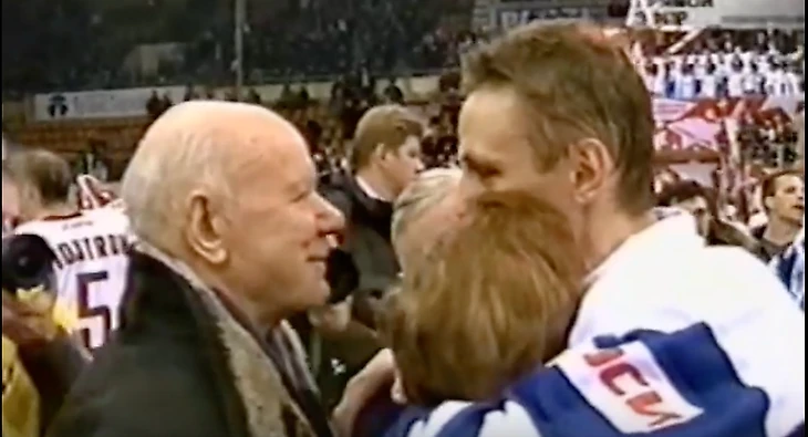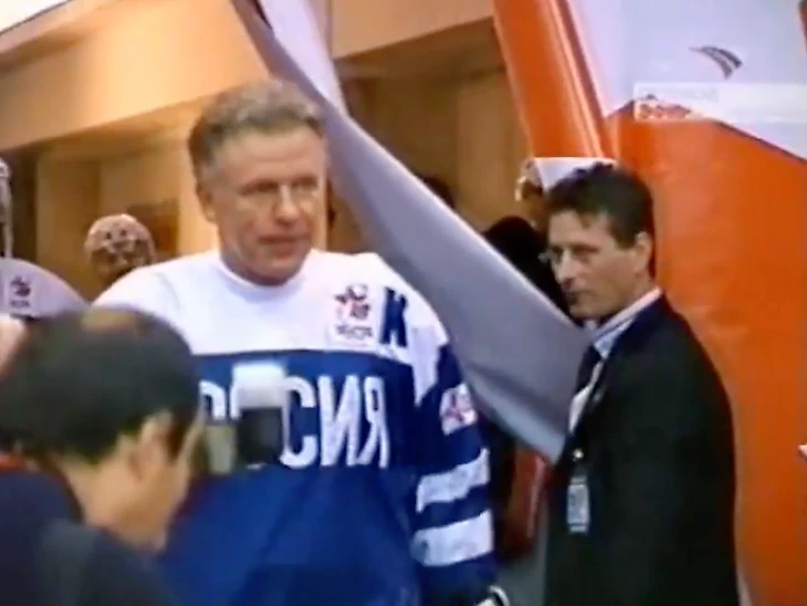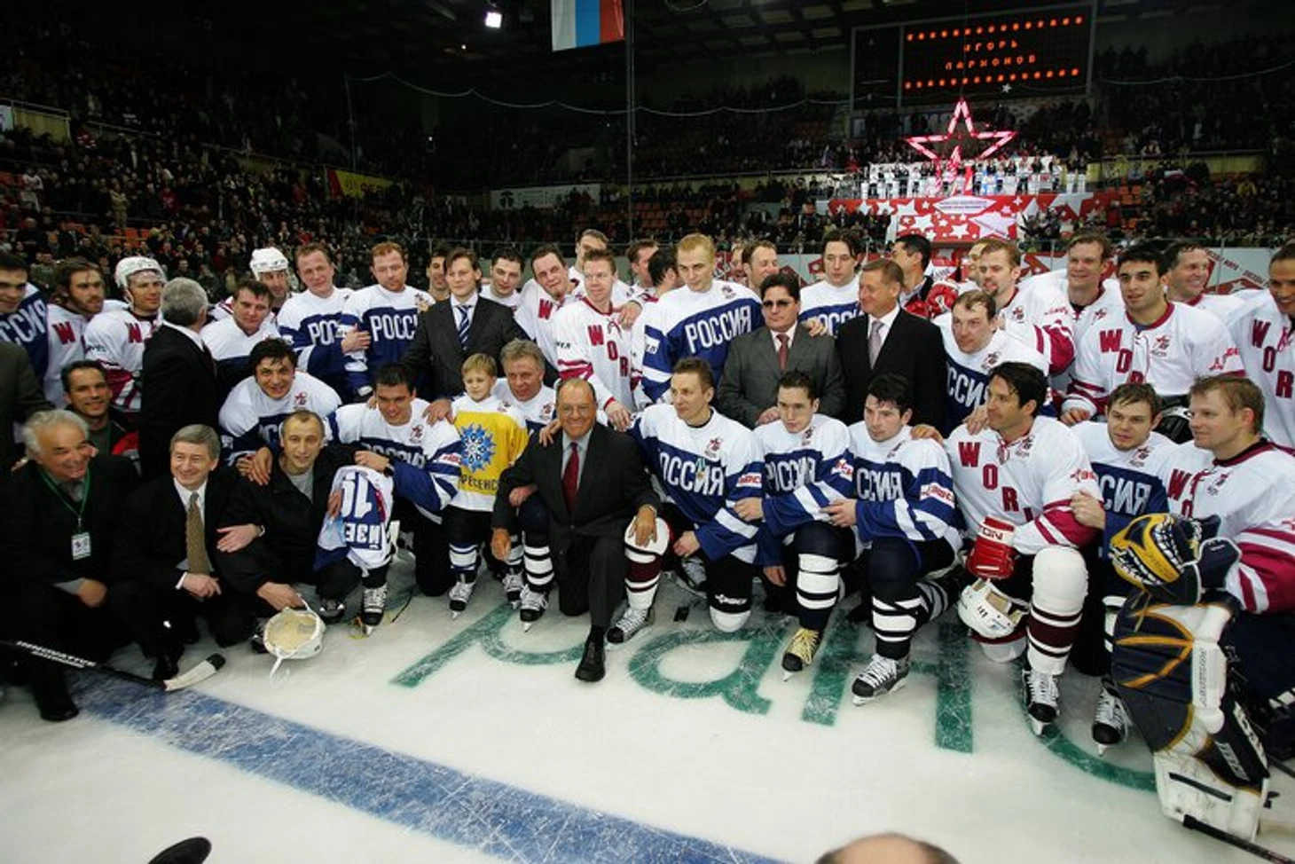 Сразу после финальной сирены Ларионов отдал на сохранение памятные краги и клюшки и переоделся из свитера сборной мира в синюю джерси с надписью «РОССИЯ» капсом. На лед высыпали люди в гражданском – в том числе руководитель администрации президента Дмитрий Медведев и председатель Госдумы Борис Грызлов.
