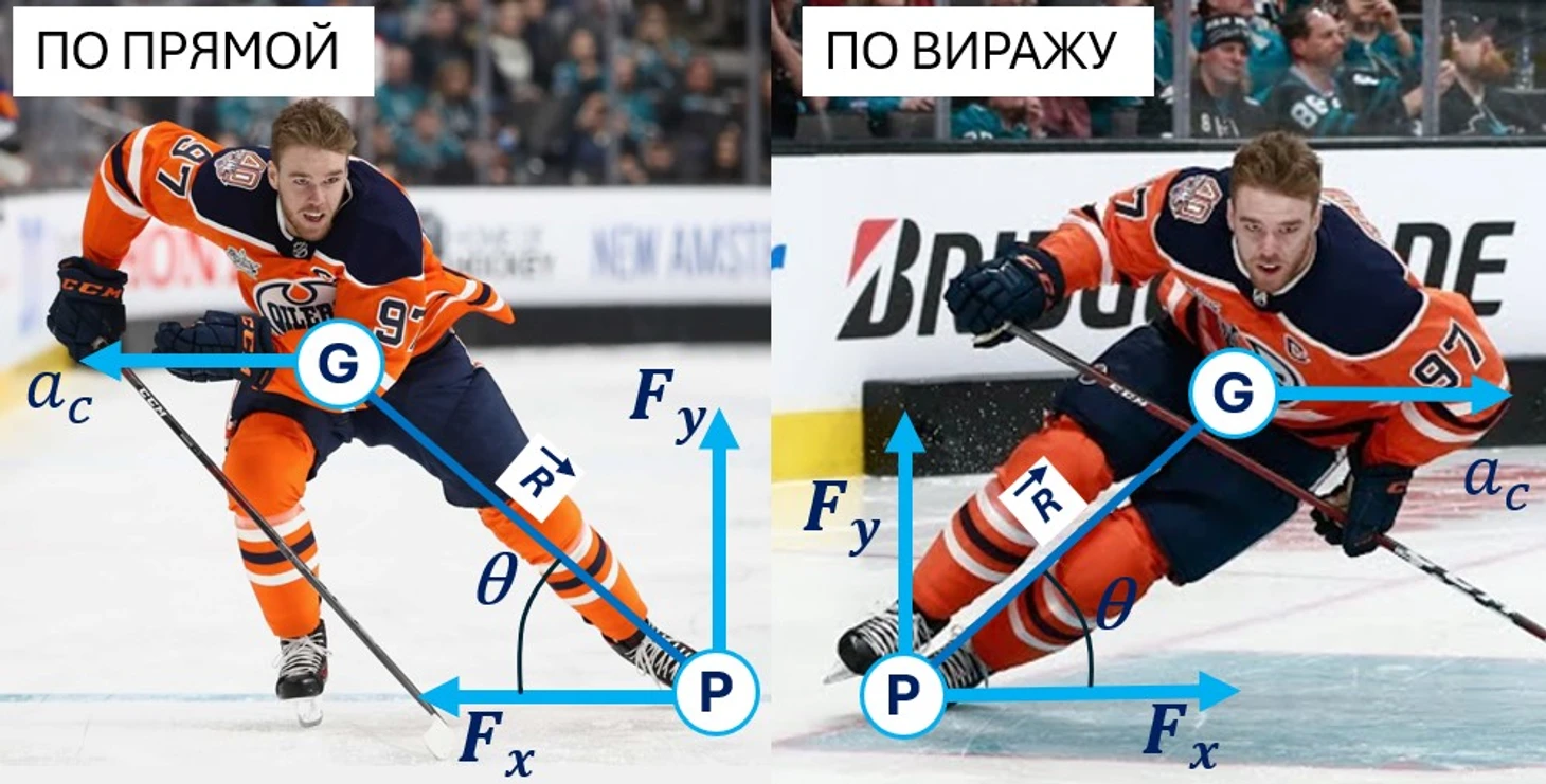 Малейший наклон конька дает Fx СРП, оттого, даже наклонив конек в голеностопе хоккеист покатит примерно по радиусу профиля конька. В вираже Fx удерживает игрока от выноса наружу, чем выше скорость или меньше радиус — тем сильнее должен быть наклон конька и центра масс (таза), корпус при этом должен быть развернут по направлению движения, для компенсации завала внутрь виража и обеспечения эффективной перестановки ног.