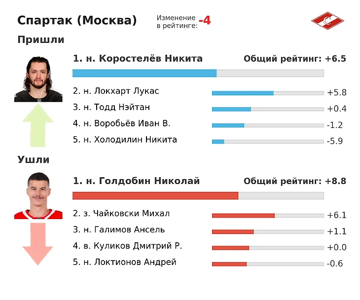 Потеря Голдобина обрушила атакующий рейтинг «Спартака» со второго места на девятое, оставив брешь в первом звене. Тем не менее глубина нападения все еще внушает оптимизм. Сохранение Адама Ружички, приход Нэйта Тодда и новых игроков создает шансы на борьбу за топ-8 в КХЛ. Дополнительным преимуществом может стать прогресс молодых игроков.