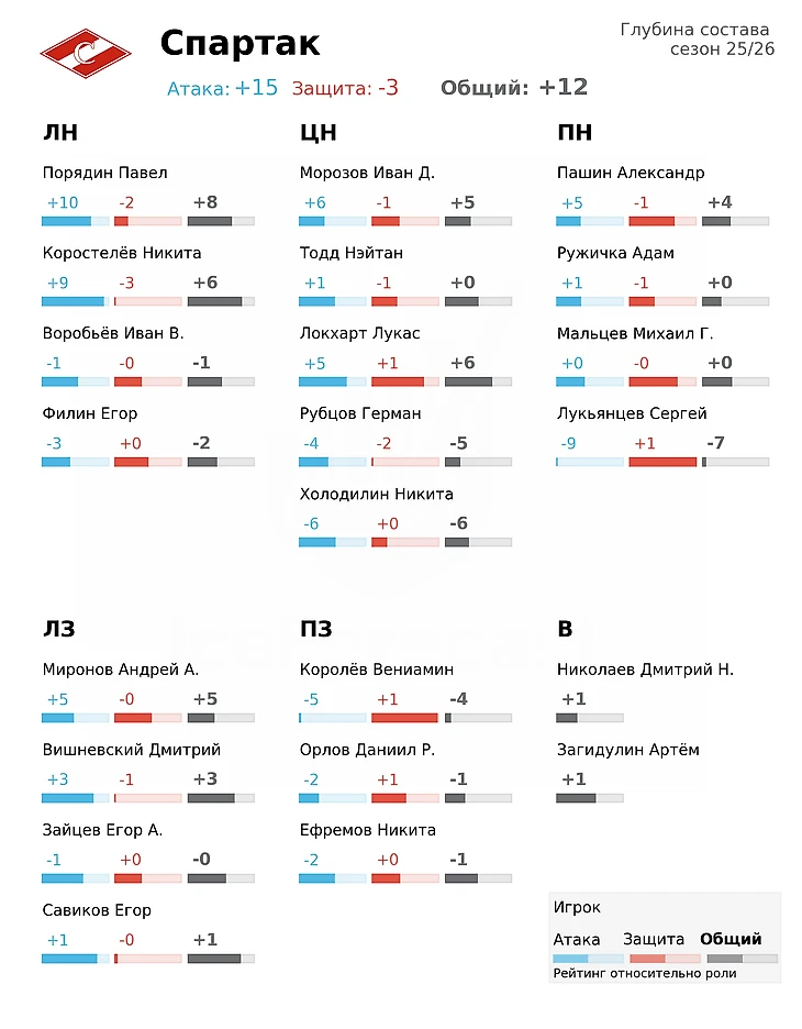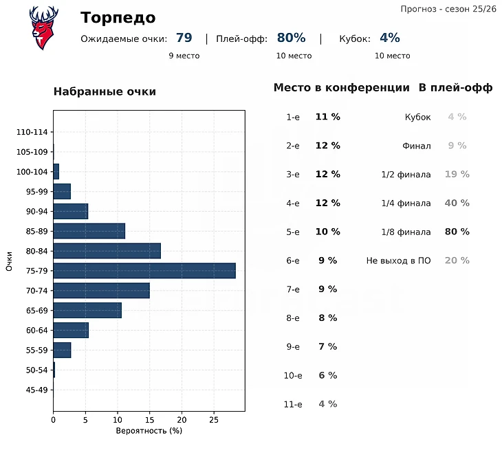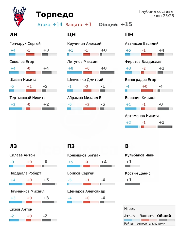 Модель пока осторожна в оценках «Торпедо» вне системы Ларионова. Атакующие метрики команды находятся на уровне 8–10 место, защитные — 14–16. Максим Летунов выглядит достойным первым центром, пусть и с ожидаемым небольшим спадом. В обороне многое зависит от прогресса Антона Силаева: его влияние модель пока оценивает с осторожностью, но вместе с Богданом Конюшковым они вполне могут создать первую пару достойную топ-8 чемпионата.