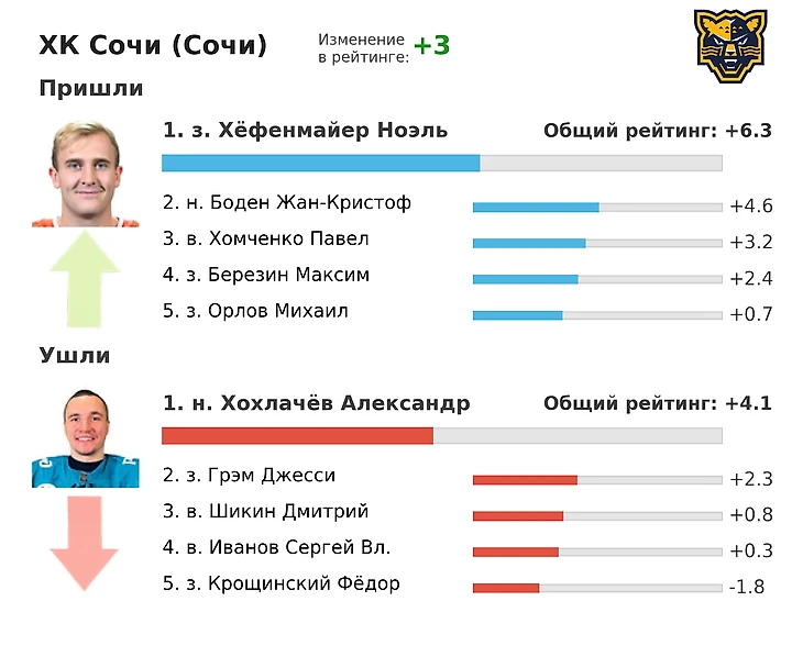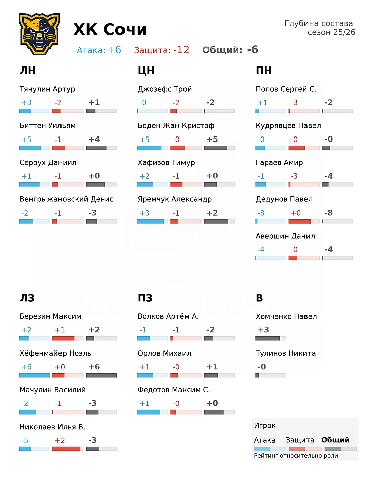 ХК «Сочи» в сезоне 2024/25 вновь остался за пределами плей-офф, и в межсезонье клуб сделал ставку на омоложение состава и развитие местных игроков. Уход ряда опытных хоккеистов позволил дать больше игрового времени молодежи, а приглашенные легионеры должны добавить команде глубины и стабильности. Основной задачей на новый сезон станет повышение конкурентоспособности в регулярке и попытка навязать борьбу за место в восьмерке конференции. Пока «Сочи» остается скорее командой-настроением, но при удачном развитии сезона может стать неприятным соперником для фаворитов.