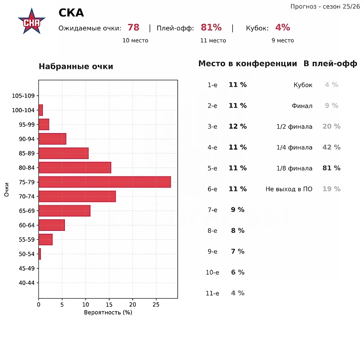 На данный момент активная работа менеджмента СКА не смогла убедить модель в том, что СКА вернется в круг фаворитов, Лиги. Тем не менее седьмое место в конференции в прошлом сезоне скорее выглядело исключением, чем закономерностью. Реалистичный сценарий для петербуржцев — борьба за топ-4 и выход во второй раунд Кубка Гагарина.