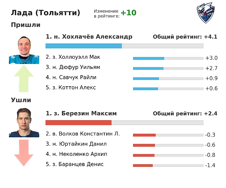 Трансферная кампания оценивается положительно. Особенно выделяется подписание Хефенмайера, набравшего более 0,4 очка за игру в АХЛ. Также заслуживают внимания Жан-Кристоф Боден, выступавший в финской лиге, и Максим Березин – единственный игрок «Лады» с GF% выше 50%. Потери команды не кажутся критичными: например, Александр Хохлачев, несмотря на впечатляющую атакующую статистику, имел слабые показатели и всего 40% GF%.