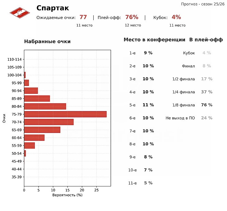 Повторить прошлогодние 87 очков и выход в четвертьфинал будет непросто. Более вероятный сценарий — 77 очков и 11-е место. Попадание в плей-офф для Спартака не должно вызвать проблем, но продвинуться дальше будет значительно сложнее.