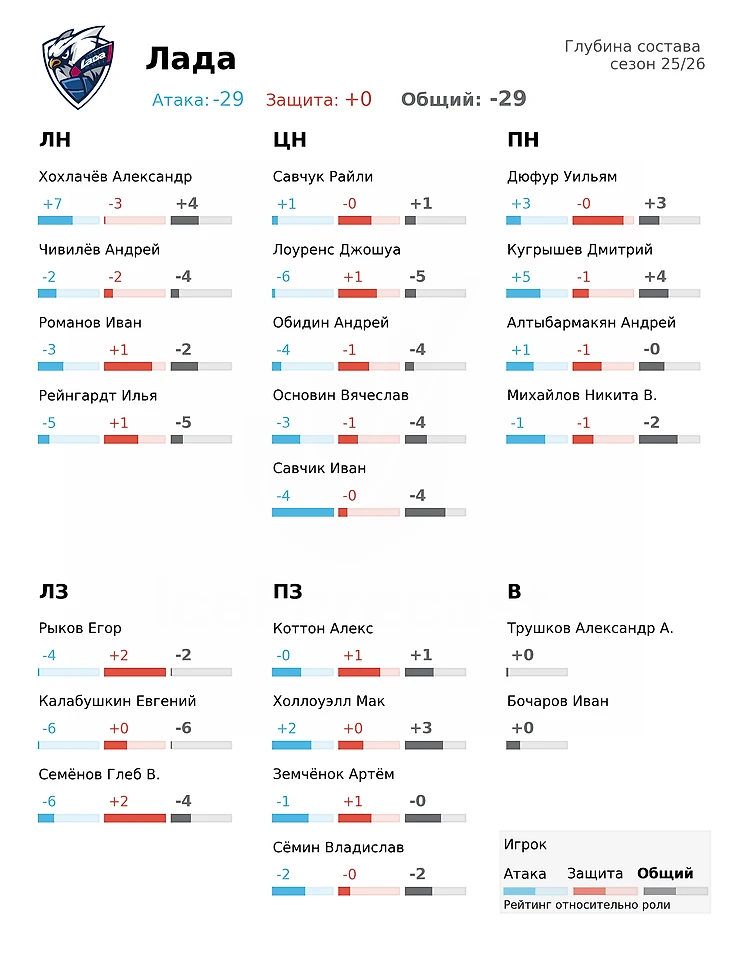 За пределами первого звена атака «Лады» вызывает вопросы: кроме первой тройки и Дмитрия Кугрышева, ни один нападающий не заработал положительный рейтинг. Зато в обороне картина куда оптимистичнее. Модель оценивает ее высоко — среди команд, не попавших в плей-офф, это лучший результат, а в Лиге «Лада» занимает пятую позицию по этому показателю. Егор Рыков вошел в топ-10 защитников по оборонительным метрикам. В совокупности модель оценивает защита «Лады» на границе зоны плей-офф (17-е место). И если ставка на Мака Холлоуэлла оправдает ожидания, у тольяттинцев есть все шансы вернуться в плей-офф уже в Западной конференции.