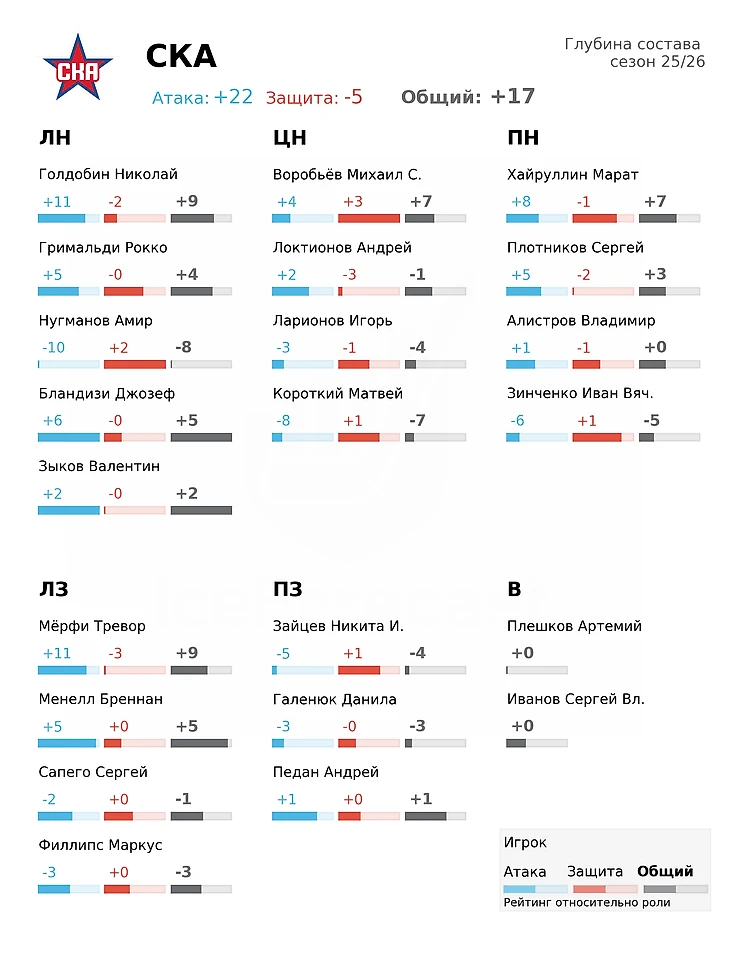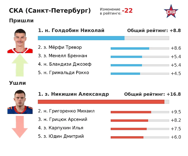 Приход Николая Голдобина (топ-10 нападающий Лиги), защитника Тревора Мерфи (топ-4 среди защитников) и ряда легионеров выглядит сильным усилением. Однако потери трудно восполнить. Александр Никишин в последних двух сезонах находился на льду при более чем 52% голов СКА, а его показатель GF% при 5-на-5 не опускался ниже 57%. Если бы он не уехал в Каролину, именно Никишин считался бы главным претендентом на звание лучшего защитника предстоящего сезона. Отдельный интерес вызывают новички Рокко Гримальди и Джозефом Бландизи: статистика относит их к крепким игрокам второго звена. Если они превзойдут ожидания, трансферная кампания СКА может быть признана успешной.