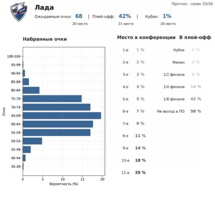 Пока модель не столь оптимистична в прогнозах, но динамика впечатляет: с начала межсезонья шансы «Лады» на плей-офф выросли на 18%, а на выход в ¼ финала — с 4% до 14%.