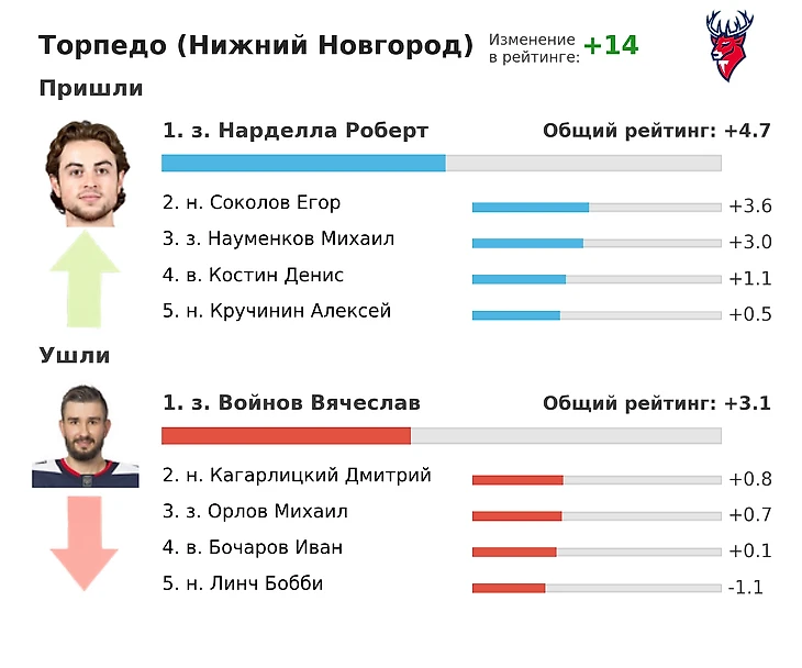Лишь 4 клуба на на трансферном рынке оказались эффективнее Торпедо – это ЦСКА, «Авангард», «Автомобилист» и «Ак Барс». Особенно большие ожидания связаны с Робертом Нарделлой и Егором Соколовым, которые успешно проявили себя в АХЛ. Михаил Науменков провел лучший сезон в «Салавате», продемонстрировав GF% на уровне 66% и став первым среди защитников в команде по этому показателю. В то же самое время Алексей Кручинин, наоборот, провел наверно свой самый неудачный сезон за «Северсталь», став вторым худшим среди нападающих с показателем GF% 48%. Потери минимальны — выделяется лишь уход Вячеслава Войнова, чьи показатели постепенно снижались с 2019 года.