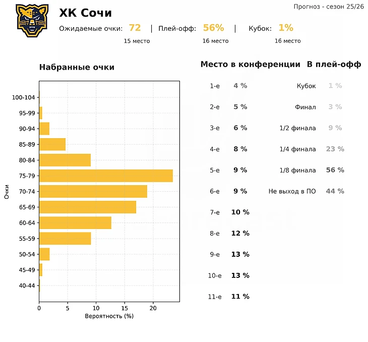 Пока тяжело представить «Сочи» претендентом на глубокое прохождение в плей-офф, но задача попасть в восьмерку вполне реальна: сейчас по шансам и ожидаемым очкам сочинцы находятся как раз на границе топ-16.