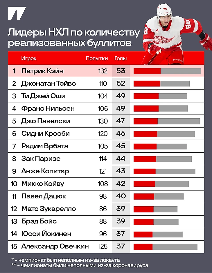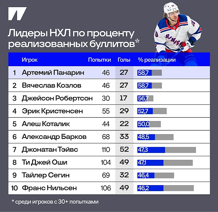 Правила чуть другие (у нас, если для выявления победителя не хватило трех буллитов, любой игрок может бить хоть все следующие; у них – для второго выхода необходимо пропустить всех остальных игроков команды), а вот тренд аналогичный. Лидирует среди тех, кто исполнил больше 30 бросков, – один из самых технически развитых игроков современности, Артемий Панарин (58% реализации).
