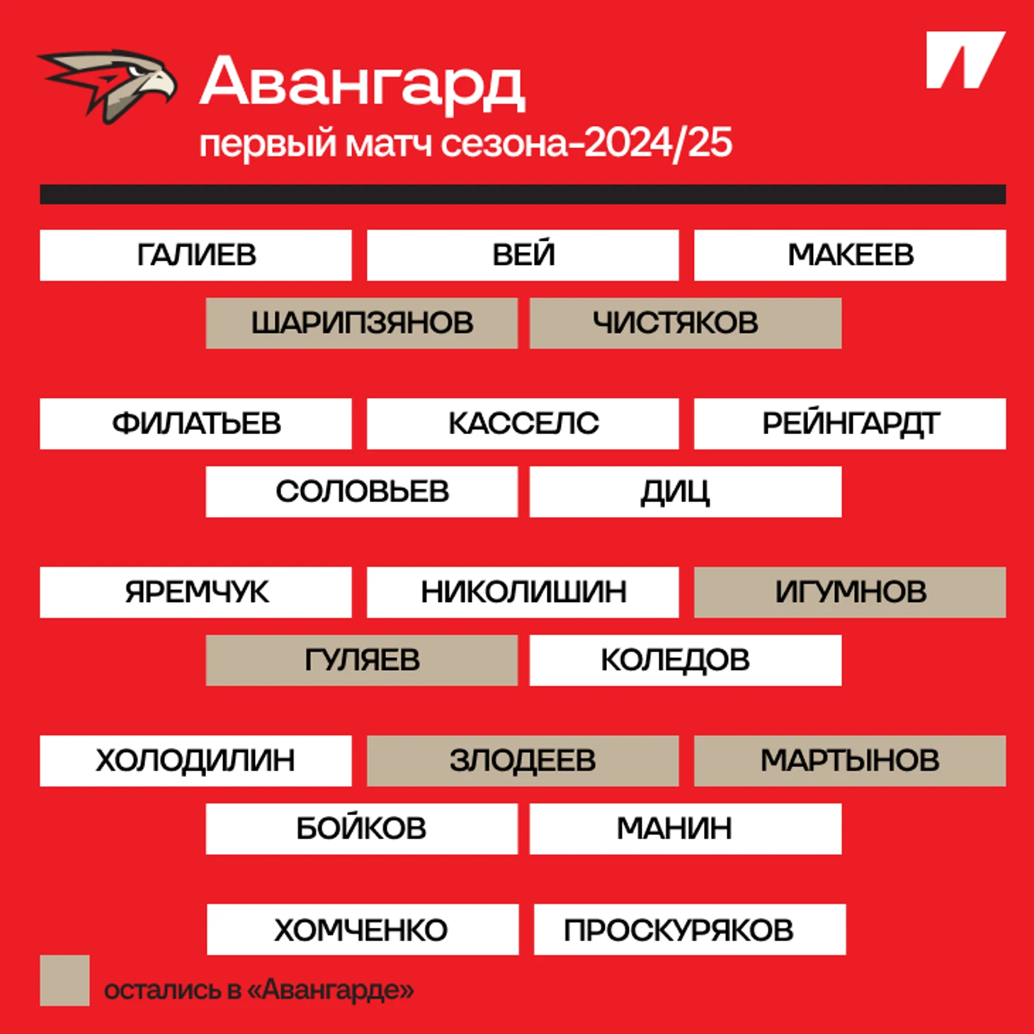 По игрокам за год также произошли кардинальные изменения. В таком составе «Авангард» начинал сезон-2024/25 против «Сибири» (2:1):