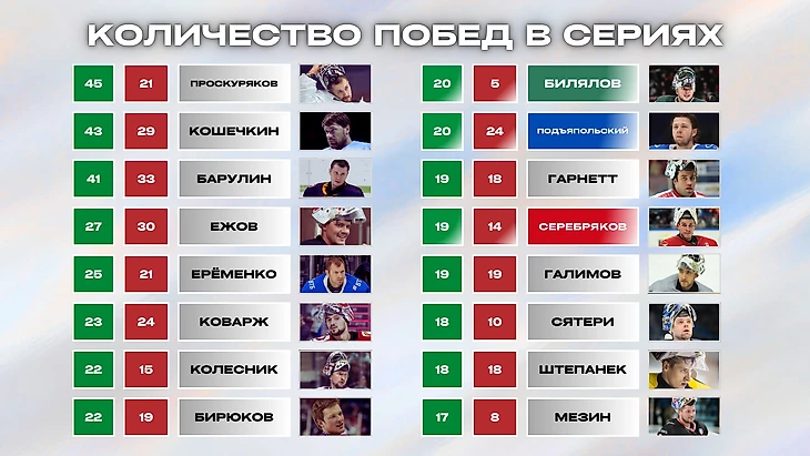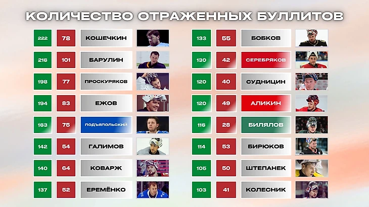 По такому же принципу работают цвета и во вратарских таблицах. Например, "Количество побед в сериях" - Проскуряков выиграл 45 буллитных серий, а проиграл 21. "Количество отражённых буллитов" – Кошечкин отбил 222, пропустил 78 (не всегда, конечно, все буллиты возможно отбить, например, в случае броска мимо створа, но в данном случае это засчитывалось в статистику отражённого буллита).