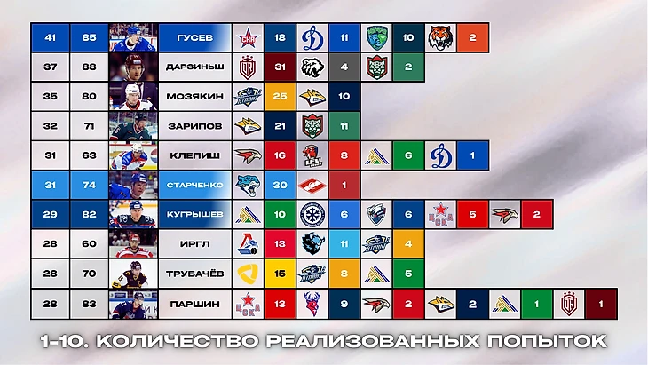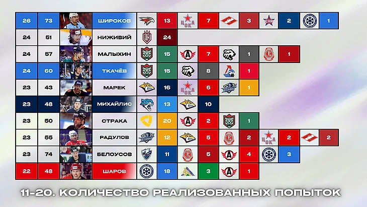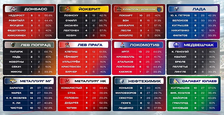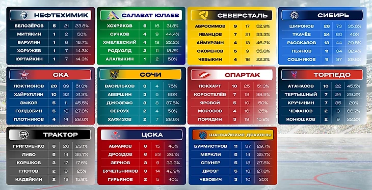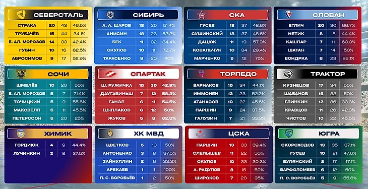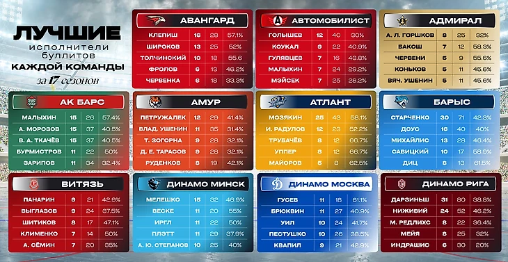 Ниже будут представлены таблицы с лучшими исполнителями буллитов каждой команды КХЛ. Критерий — количество заброшенных шайб.