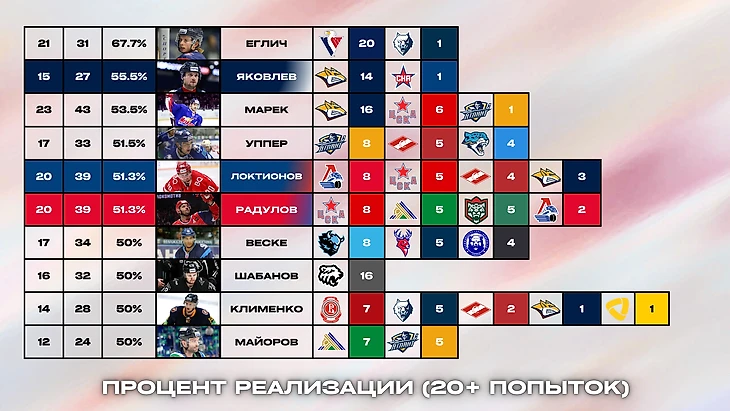 Любопытно, что до сезона 2017 / 2018 (сезон, когда были введены пяти-бросковые буллитные серии) лучшие игроки по количеству реализованных бросков забивали минимум 8 шайб; в то же время с сезона 2017 / 2018 этот рубеж удалось перешагнуть лишь Александру Шарову. Так что с учетом 68-матчевого календаря и возвращения к трех-бросковым сериям, есть все основания ожидать, что цифры в данном компоненте вырастут (однако, необходимо учитывать наличие формата овертайма 3х3, с сезона 2016 / 2017 значительно сократившего наступление буллитных серий).