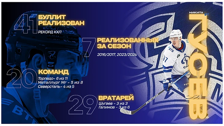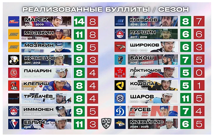 Абсолютным лидером по количеству реализованных буллитов является Никита Гусев. Форвард московского «Динамо» уже в ближайшее время может первым в Лиге покорить отметку в 50 голов. Гусев имеет солидные цифры по буллитам и в НХЛ, где нападающий реализовал 7 попыток из 12, в том числе и в ворота действующего обладателя «Харта» и «Везины» Коннора Хеллибака.