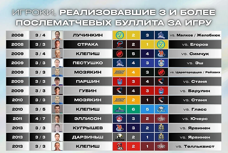 Однако отметим, что Лига несколько раз выпускала статистические дайджесты о буллитных сериях, в том числе и в прошедшее межсезонье, где были представлены ТОП-5 игроков за 17-летнюю историю Лиги по количеству реализованных и победных буллитов, а также по проценту реализации.