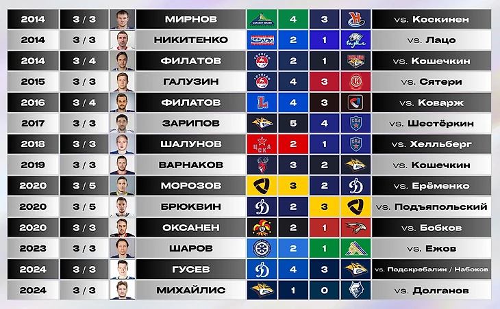 Обратить внимание стоит и на автора Золотой шайбы Кубка Гагарина-2012 Якуба Клепиша — единственного игрока, имеющего в своем активе целые три буллитные серии с тремя голами, а также на встречу между «Северсталью» и «Динамо-Москва» в феврале 2020 г., где голевую перестрелку между собой устроили Егор Морозов и Владимир Брюквин.