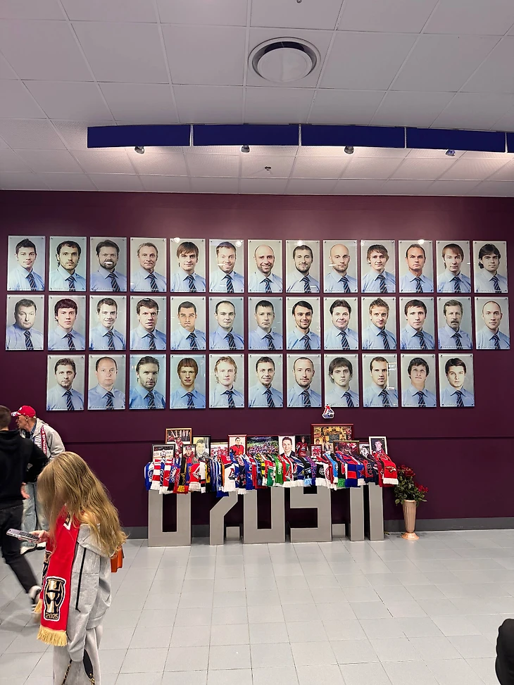 Матч начинается 19:30, есть время прийти заранее и прогуляться по арене. Около монумента «Хоккейное братство» много цветов.