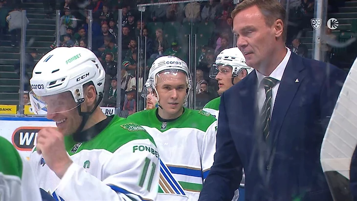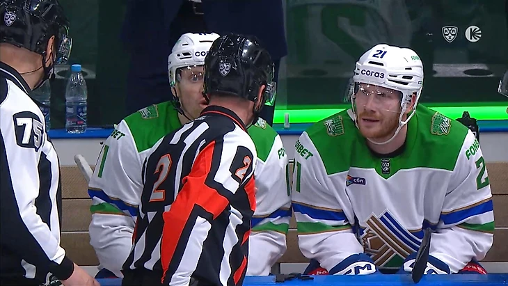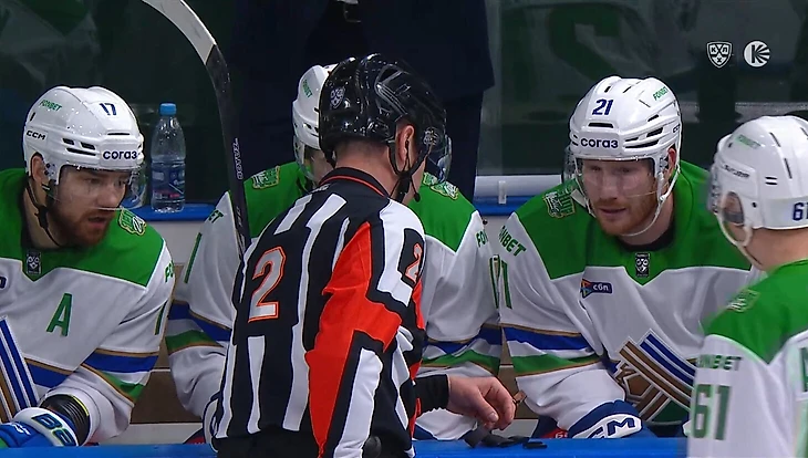 Судья обнаружил необычный предмет на льду, подобрал его и поехал к скамейке гостей. Интересно, каким был диалог арбитра и игроков «Салавата»?