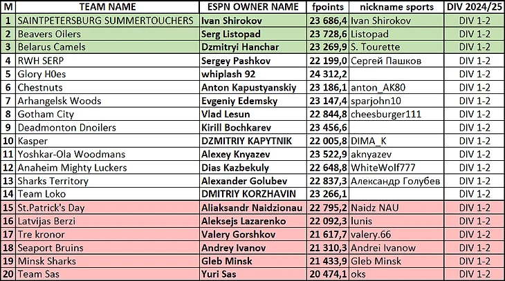 * в таблицах зеленая зона - поднялись в дивизион выше, красная - опустились на дивизион ниже