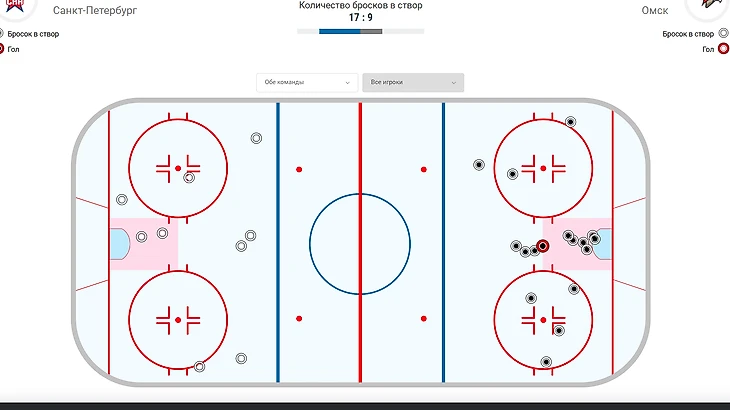 Она наглядно показывает, как проходила встреча в этот 20-минутный таймлайн. Отдельно стоит отметить броски из «слота»: 6 — 2 в пользу СКА. А это уже наглядно показывает, как «Авангард» позволял сопернику куражиться у собственных ворот.