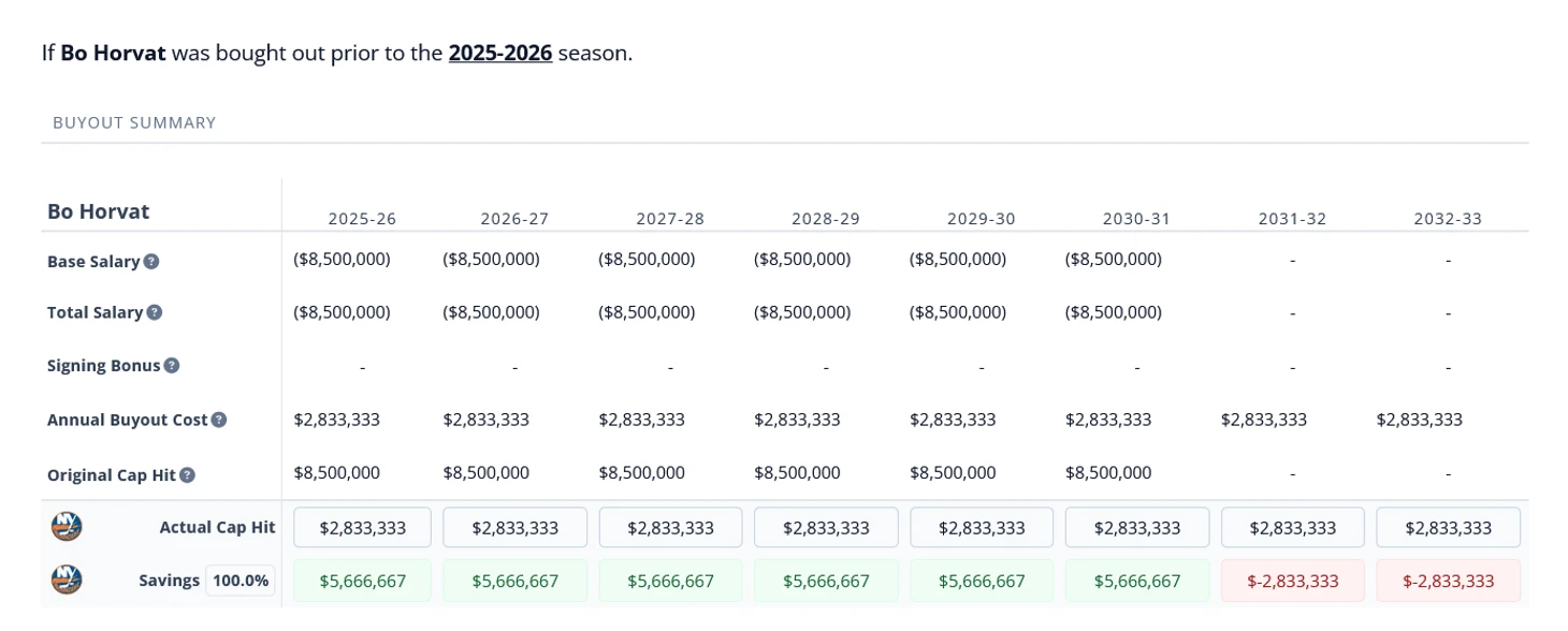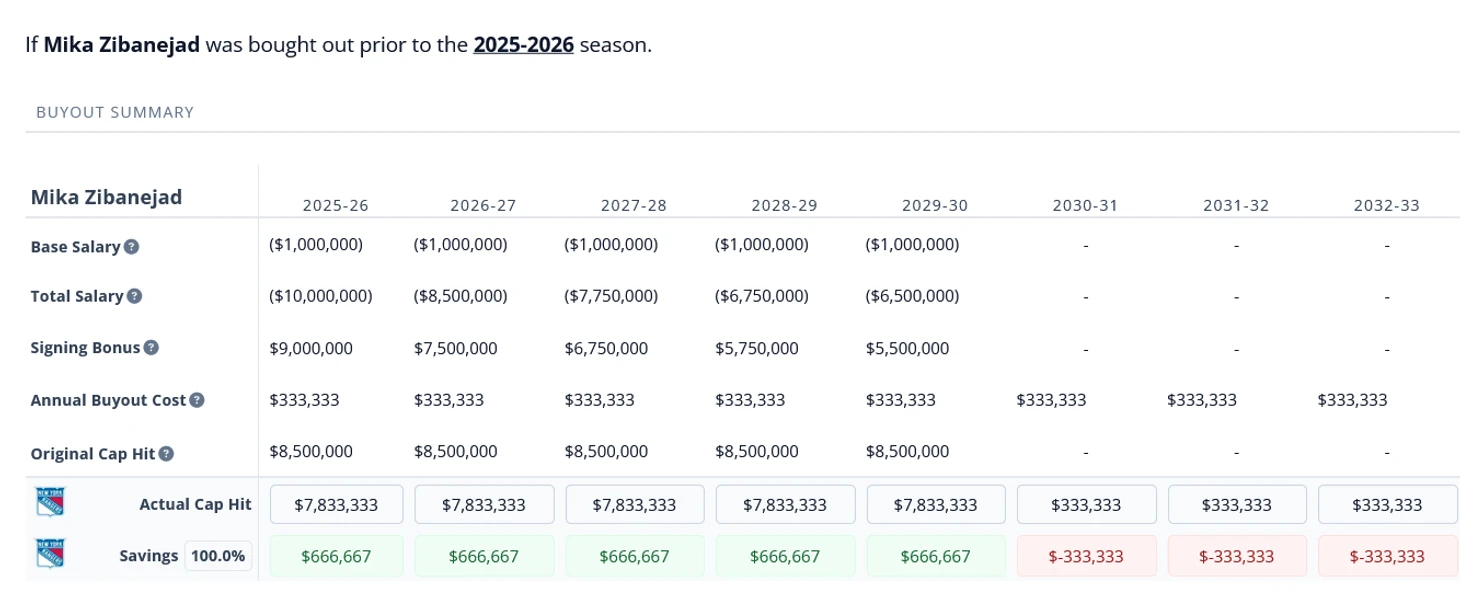 Его выкуп не вариант из-за структуры его контракта. Ниже приведу две картинки с выкупом Зибы и Хорвата из Айлс. Обратите внимание на строку с бонусами и две последних с кепкой и сохранением. Все очень красноречиво. И разумеется, Айлс не собираются выкупать игрока, контракт приведен из-за одинаковой зарплаты двух игроков и показа важности конкретики структуры контракта.
