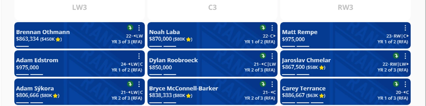 У команды и так боттом с преимуществом, с шансами ряда игроков войти в топ-6 при дальнейшем прогрессе. Отманн, Берард, Эдстрем, Ремпе, Тэрранс, Кэррик, Сикора – уже более чем остаточное количество для боттома. Лаба может подключиться, либо играть максимум игрового времени в волчьей стае, включая PP1, либо сразу в основе при доверии ГТ, вплоть до игры на позиции 2C при необходимости. Рубрук тоже на подходе. Более того, игра за основу повышает их торговую стоимость. Цена за одного игрока нижней шестерки вызывающегося в основу и игрока стабильно играющего в составе сильно отличается. Эти игроки ничуть не хуже того же Шири, Пярссинена, Рэддиша. Без этих троих, особых игровых перемен бы не произошло, кроме увеличения доходности клуба при возможном трейде. Хотя мотивация их приобретения вполне понятна.