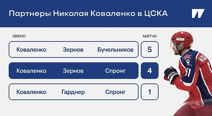Как и весь ЦСКА, Коваленко начал сезон довольно нестабильно. В первых матчах тренеры наигрывали его с Зерновым и Бучельниковым, но у этого звена мало что получалось. После игры против «Локомотива» Никитин внес корректировки: заменил Бучельникова на Спронга.